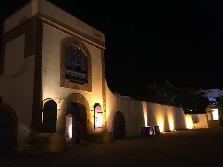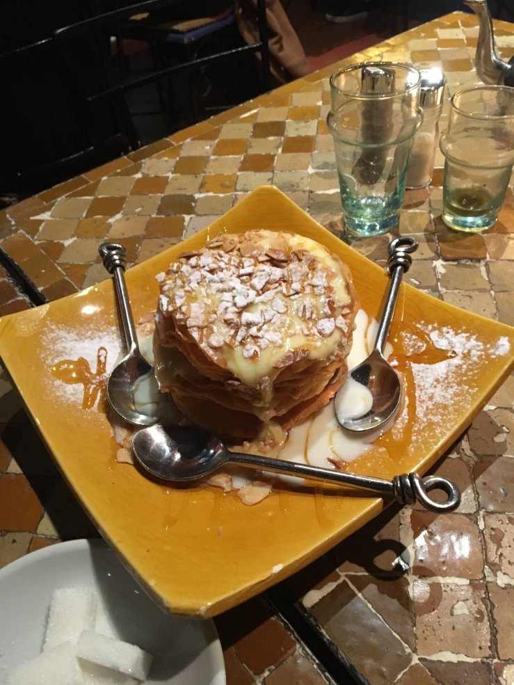This restaurant is located in the old fort. It has some outdoor tree-shaded space and some glassed-in inside areas. We opt to eat inside as it’s not very warm outside, but the tree-covered area looks like it would be lovely in summer. We order mint tea, mixed starters, tagine, and a fabulous dessert called jawhara. Jawhara was a fabulous discovery. If you can imagine honey nut cornflakes, but the cornflakes are the size of a side plate, and the honey and nuts are poured fresh over them with some kind of condensed milk. Surprisingly it wasn’t as sweet as we expected, and it was delicious in a sweet-sticky-crunchy way.