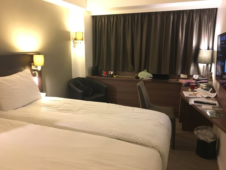 I have a mini-fridge and a safe, not that I’m going to use either of them. There’s a desk space with lots of power plugs nearby. The lamps all have obvious on/off switches – I love that I don’t have to puzzle for ages over how to switch off the lamps. (In other hotel rooms I have pulled out the plugs to switch off the lamps because I could not find any other way to switch them off.)