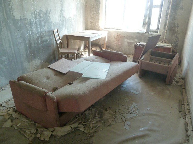 We passed by one of the city’s schools, to demonstrate the reason that tourists are not allowed inside the buildings anymore. It is partly collapsed, classrooms now fully open to the elements, several levels now just a pile of rubble, providing a climbing frame for the creeping forest plants. I expect more buildings will collapse in future – the combination of Soviet building standards and no maintenance, combined with hot summers and freezing winters will start to take its toll.