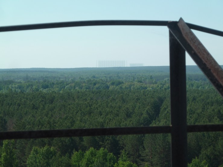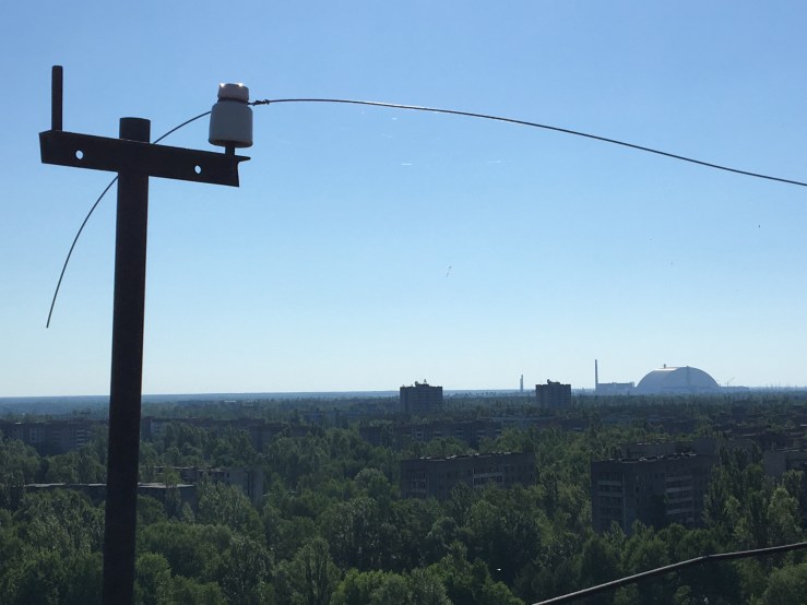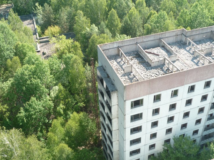 We entered the city of Pripyat, once a shining example of a modern Soviet city, prosperous and privileged due to the highly skilled workers at the nuclear plant. Our first stop was an apartment building, taller than the one we had visited in Chernobyl-2. Of course, there is no working lift anymore so we walked up 16 flights of stairs to the roof. The views from there revealed two things – one, the proximity of the reactors to the city; and two, the extent to which the trees had taken over in the area.