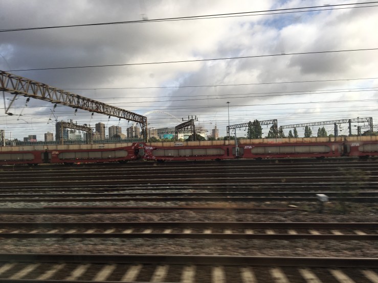 For a brief moment I see a canal and a motorway out the window and I think about the industrial history of this country encapsulated here – road, canal, railway – all travelling in parallel. But then the landscape shifts and the motorway disappears in a different direction.