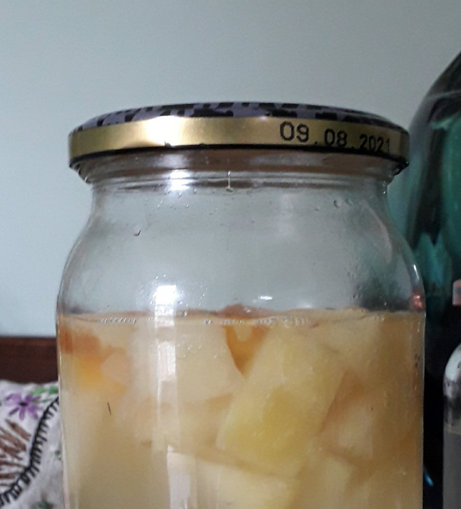 The course also gave us water kefir grains, and these also needed feeding. Water kefir was unfamiliar to me but has been the most successful of the fermented drinks so far. I fed the grains with water and sugar over several days and then drained the liquid off, added fruit (all we had in the house was frozen tropical fruit, which I defrosted before adding to the water kefir water) and left to ferment.