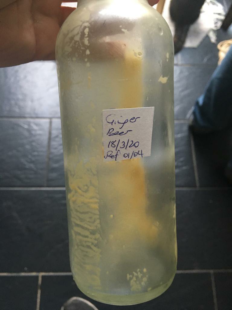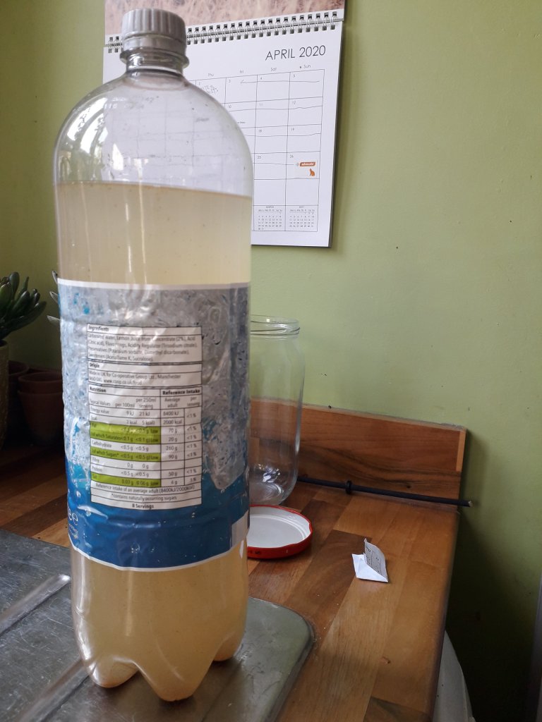 While reducing our cupboard stocks during the Covid lockdown, we found an old (and quite out of date) ginger beer making kit which required a 2 litre plastic bottle. We’d been keeping one for exactly this purpose and now we had no other reason not to do it. So my husband mixed up the spice, the yeast and water, let it brew at room temperature for three days and then bottled it in plastic. It’s not showing much sign of activity yet but I’m turning it over every day in hope that moving the sediment through the liquid will encourage some degree of fermentation to take place.