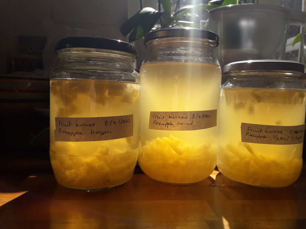 Having recently made a fruit cake, for which we only needed half a tin of pineapple (let me know if you want the recipe), I decided to have another attempt at fruit kvass, using the tinned pineapple, and the last of a bag of frozen pineapple we found at the bottom of the freezer. (One good thing about lockdown, we are finally using up the “lurkers” from the back of the pantry and the bottom of the freezer.)