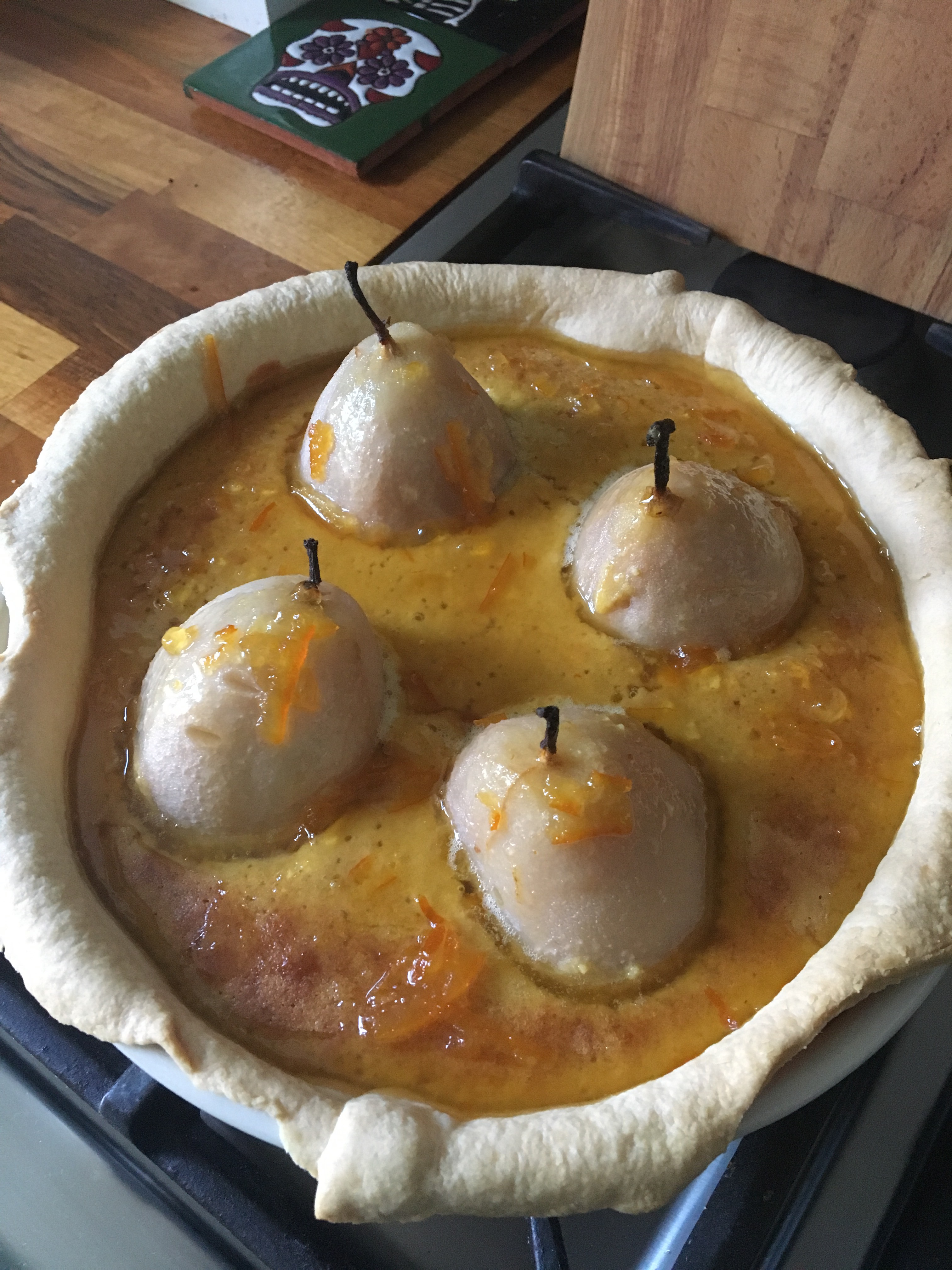 Food This week we used up the pears that have been sitting in the fruit bowl for… well… I don’t know how long. But several weeks. They ripen not, neither do they rot. So we poached them and plonked them into pastry following the Higgidy Pear and Whisky Tart recipe. A note to anyone thinking of trying this recipe – it advises a long thin pie tin, all the better to cook the frangipane to a satisfying crumbliness. However we put it in a round pie dish, which meant the frangipane in the middle was instead cooked to a warm gooeyness (But it was still tasty).