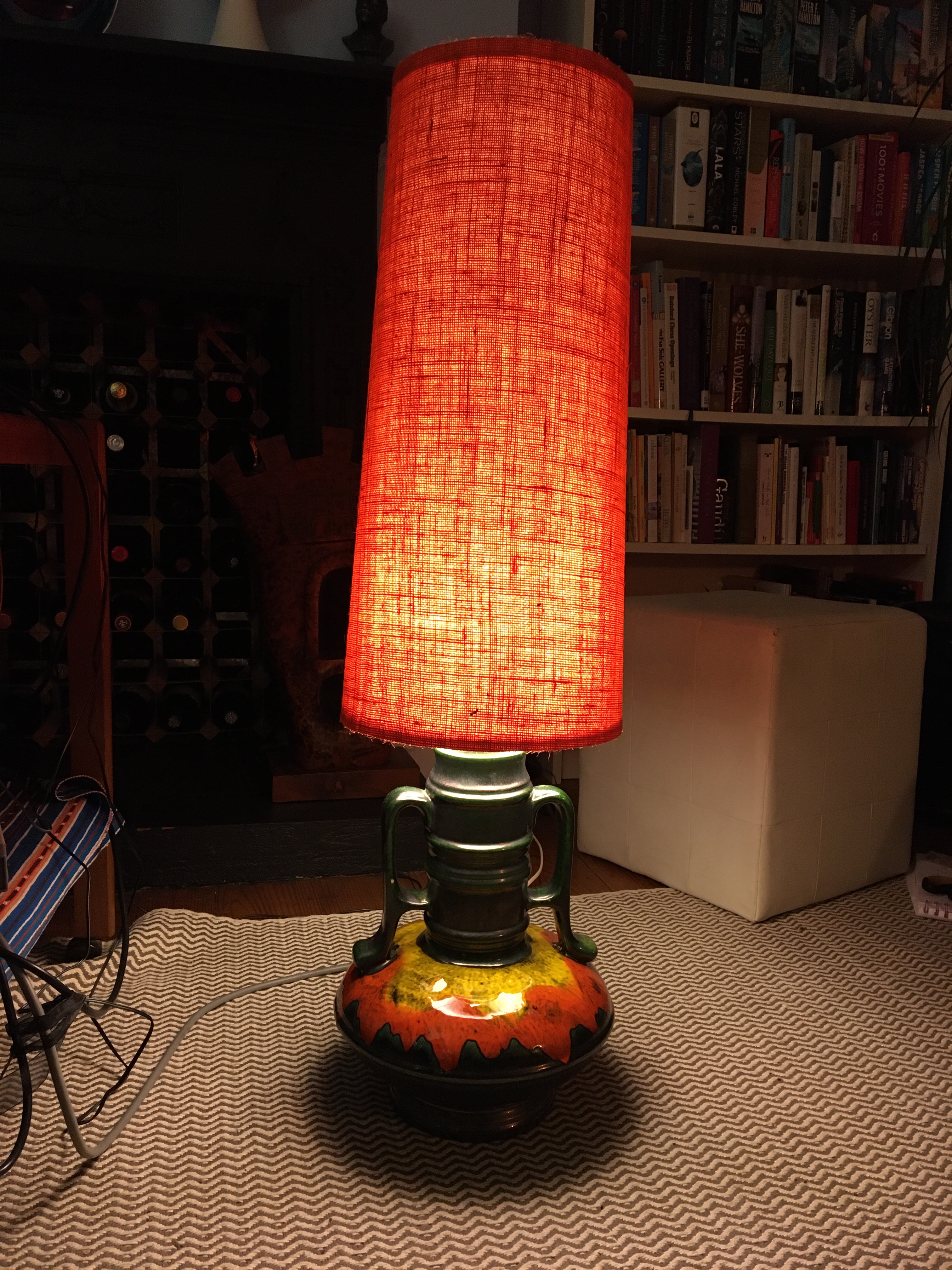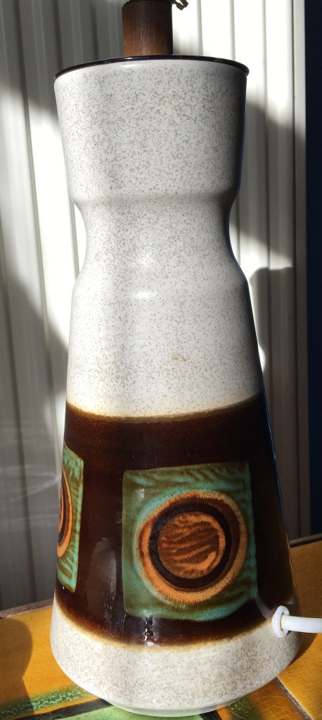 This week’s excitement: The big orange lampshade arrived in the post. Having bought two ‘bald’ West German pottery lamps while in Ramsgate (was that only last week?), Husband has been on the hunt for suitable lampshades to fit them. The bold dark green, orange and yellow lamp now has a tall orange lampshade on it. To me, this lamp now looks like a squat person with their hands on their hips, wearing a very tall hat.