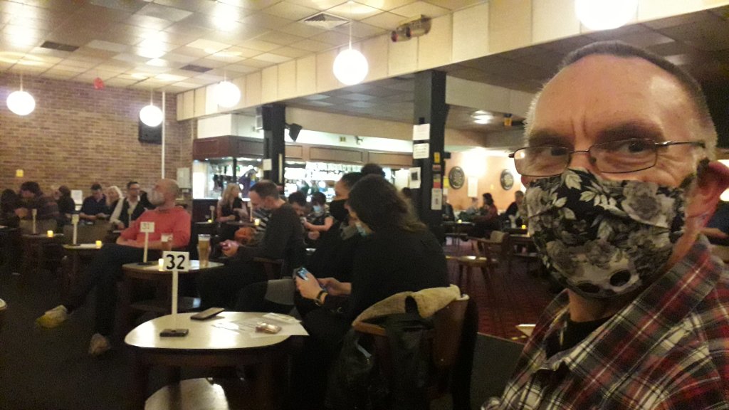 Tonight was the second of three Red Imp comedy nights – Jen Brister and Zoe Lyons. They both apologised for being rusty in their delivery. I gather from their material that this may be the first time they’ve been face-to-face with an audience in many months. (Face-to-face, albeit with the audience behind masks to stop our expectorative laughter potentially infecting someone). The MC, Walthamstow Local Susan Murray, expressed her delight at having re-scheduled this particular gig from its original proposed date of the 22nd to the 14th, even before there was a whisper of Tier 3. Meanwhile, I’m working my way through the various flavoured gins available at the Trades Hall. So far I’ve had Sevilla Orange, Blackcurrant, and Rose.