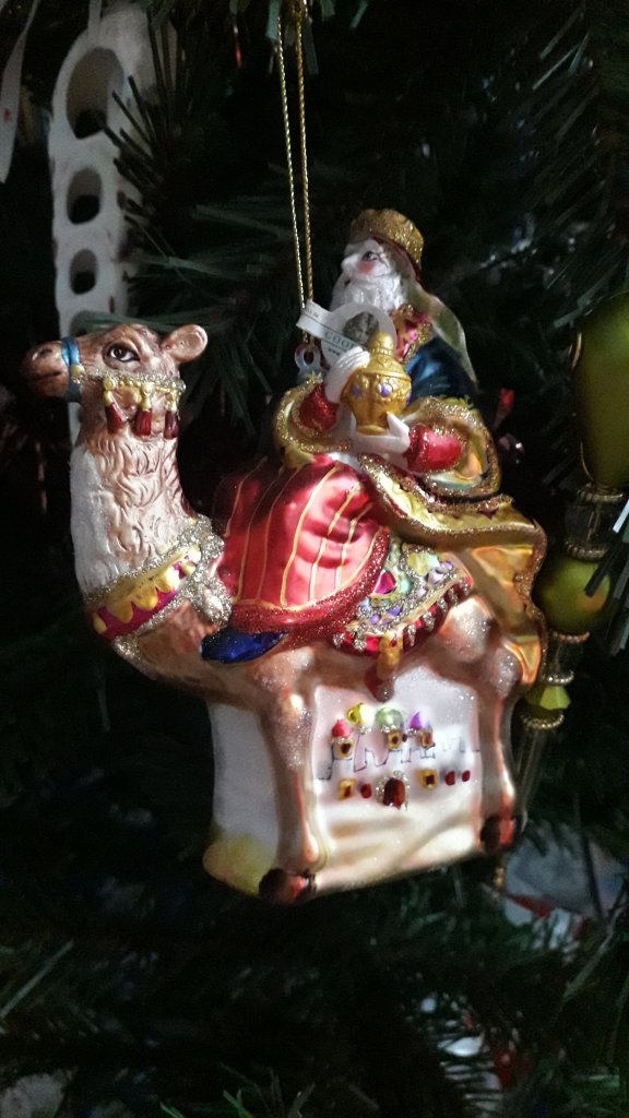 One of the three magi, this one is huge. He came from a Christmas shop in Stratford-upon-Avon, where I was impressed by the size, the detail, and the shiny sparkliness of him and his camel. There were two other magi for sale but this was the brightest and most glitzy of the three and that’s how he got my vote.