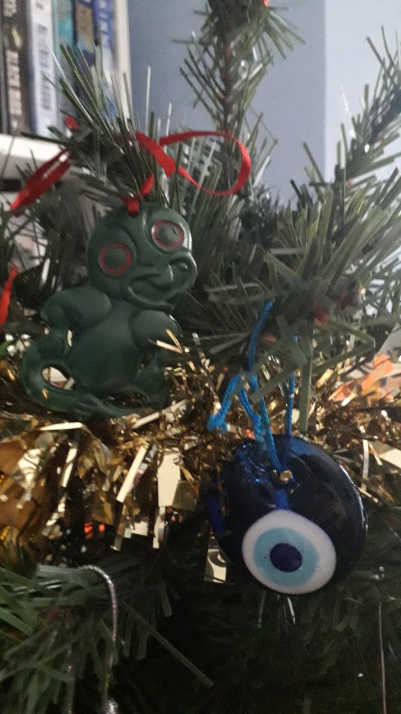 Two lucky symbols here. Blending in with the green of the tree is the tiki from New Zealand. Air New Zealand in fact. We found it in my Dad’s bedside drawer when tidying up after he died. He never flew with Air New Zealand, so it must have been a gift from my older sister many years ago and he kept it. It sits up high on the tree, next to the evil eye from Turkey. I like to think by putting these two high up on the tree, they will protect our Christmas.