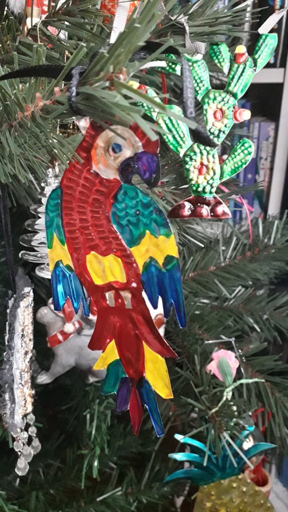 The parrot, the cactus and the pineapple – they all come from Central America. The pineapple I think came from Guatamala, but the cactus, the parrot and several other colourful tin ornaments came from a tiny shop in Oaxaca. When I find a shop that has things that make good Christmas ornaments I get ready to hand over all my money.