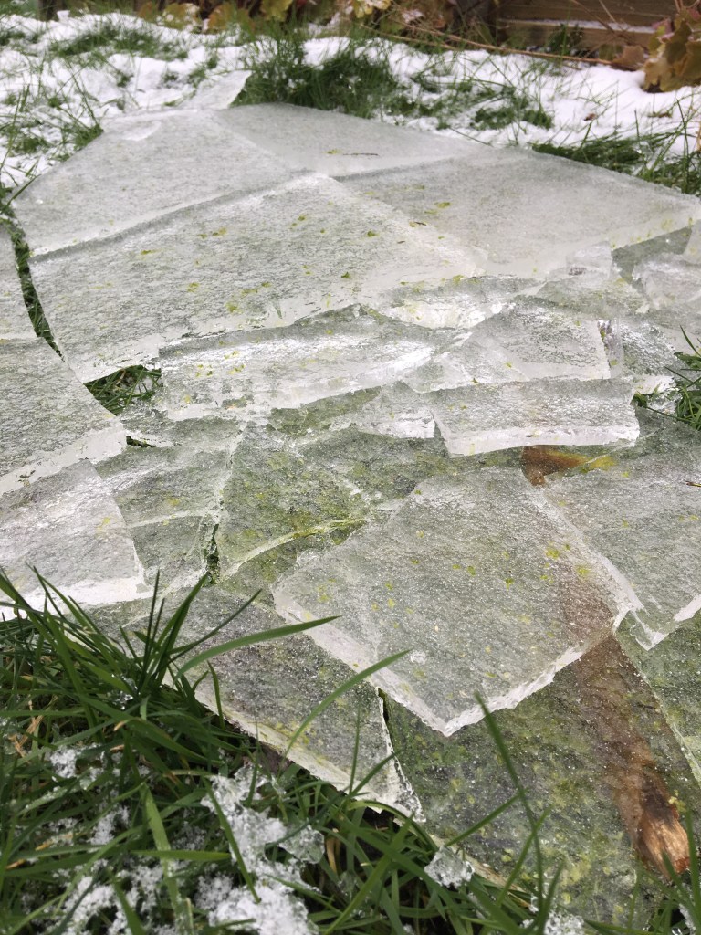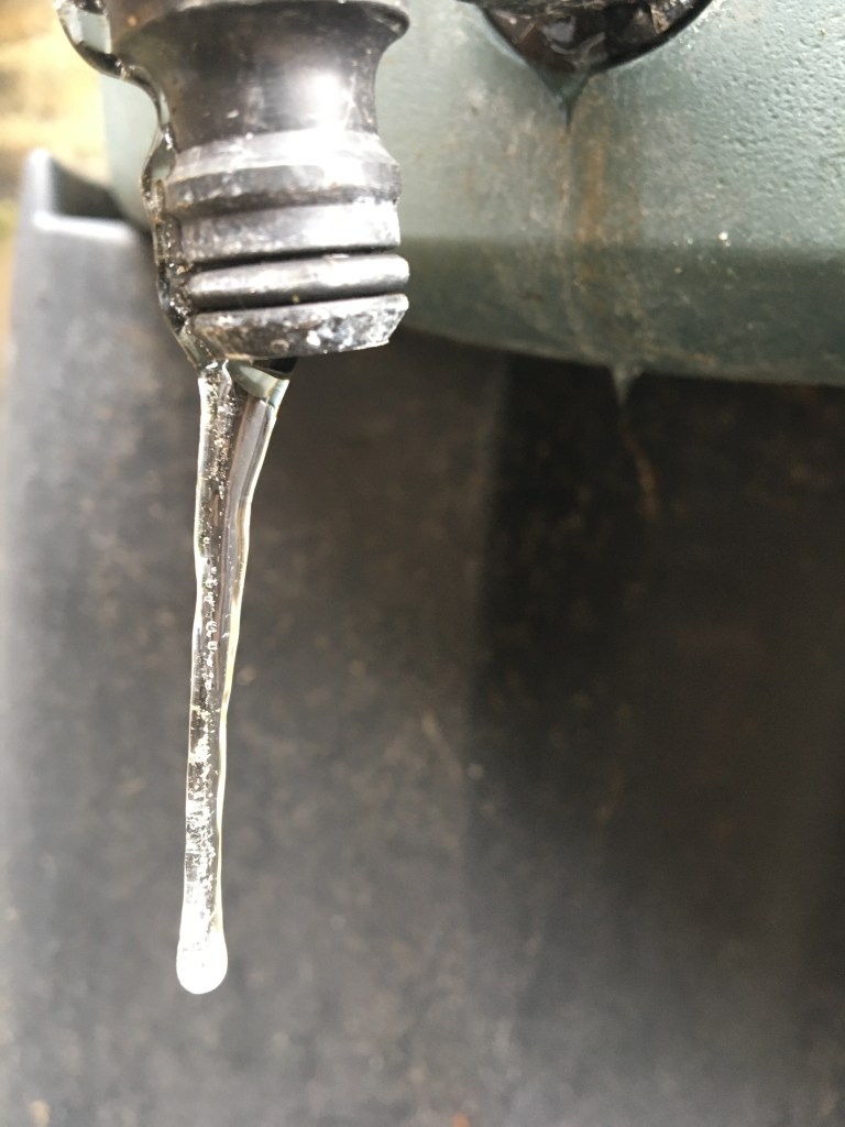But the temperatures have been consistently cold enough that our pond froze over every night this week, requiring us to go out every morning and make a hole in the ice to keep the water open because we have newts in the pond, and for the sake of the wildlife we have to keep the water open to the air. The pond ice was thick like a sheet of glass. Our water butts were also frozen solid, with drips of water from the tap frozen solid like we were in Siberia.