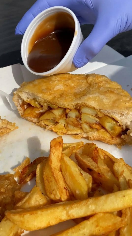 Several chippies (takeaway food establishments specialing in deep fried food – mostly chips) in the North of England have taken the butty one step further. Make your chip butty, dip it in batter, and deep fry it… and then serve it with a side of chips, of course.