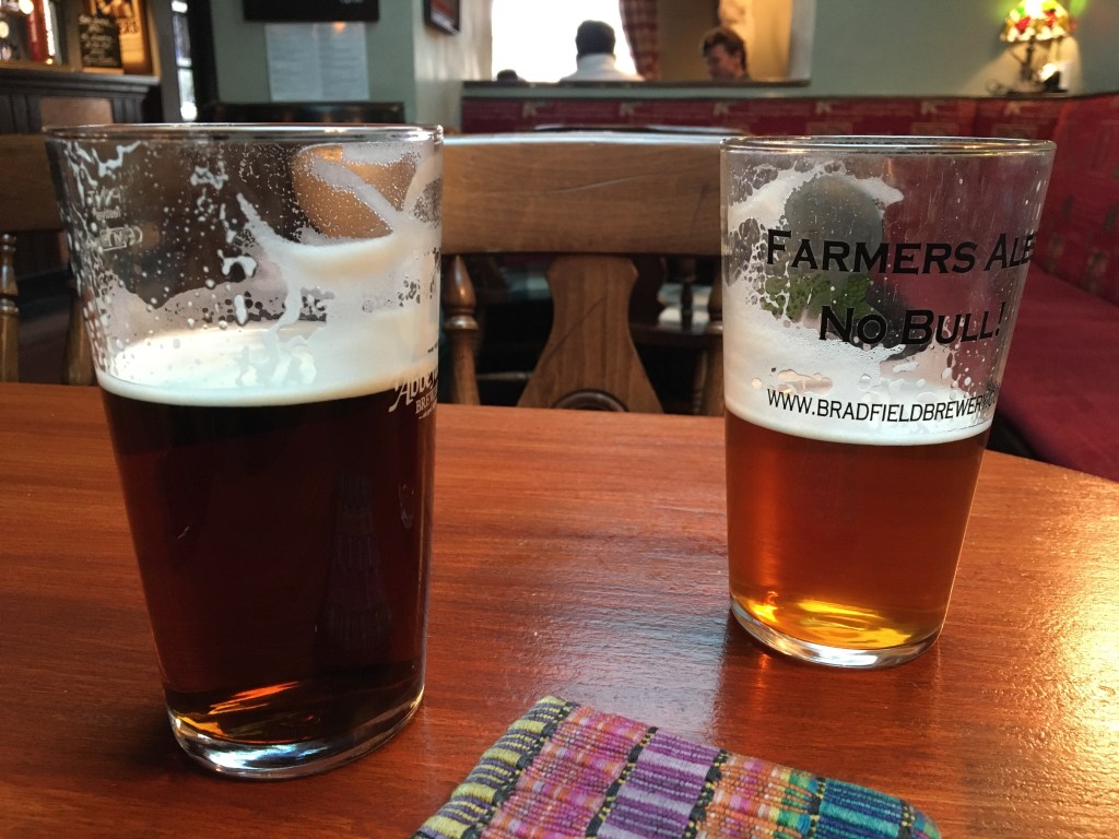 Thursday: The weather was not as bad as we’d expected, so we decided to walk to Hope, the next village over from Castleton. The path took us by a stream, through some woodland, and across fields of sheep with fine views of the nearby concrete factory. Hope turned out to be just as small as Castleton, with not much to do, so we dined at the Hope Cheshire Cheese pub (it’s a popular pub name in these parts). We had a Ploughman’s between us which was good but not great (the bread and the pickle was fine, but for me a good Ploughmans should have three cheeses plus some fruit – apples or grapes – and a pickled onion). We purchased some food supplies at Watson’s farm shop and walked back through the fields to Castleton.