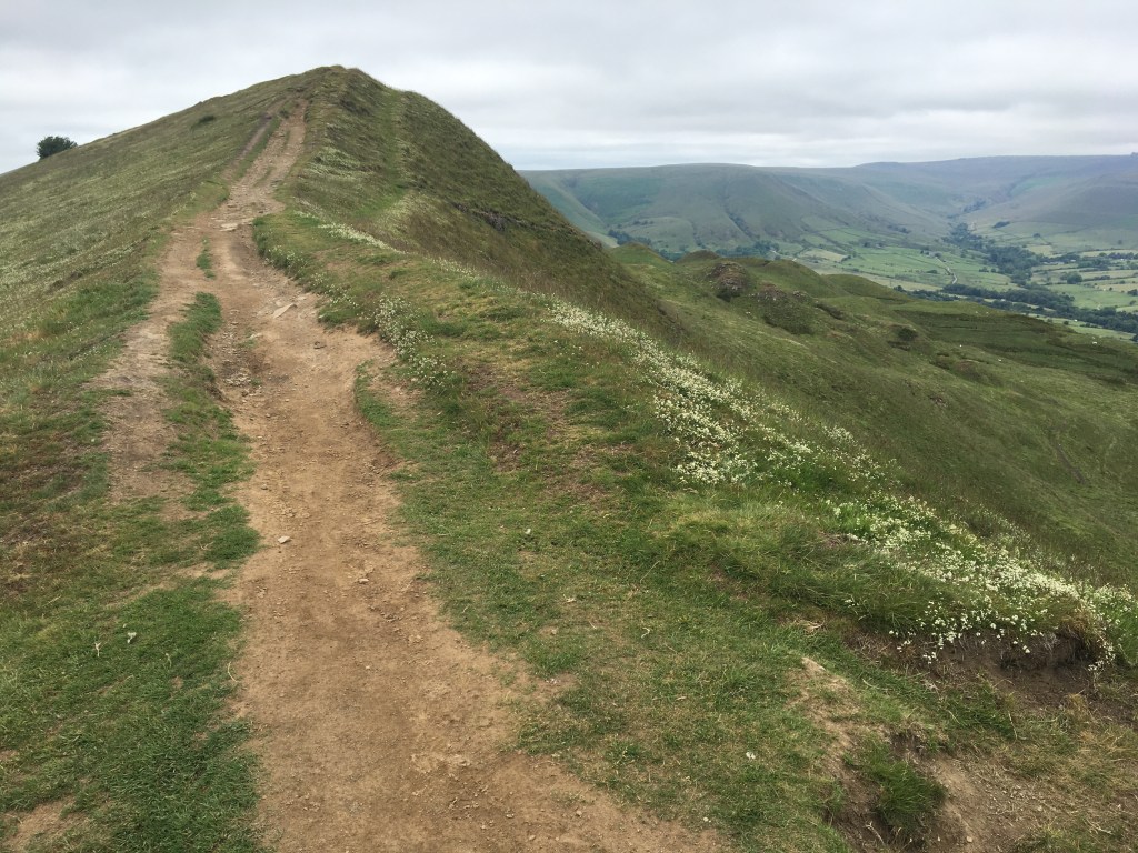 Saturday: An awkward weather day – warm and humid but also overcast and windy in parts. Difficult to know how to dress or what was appropriate especially when hiking up from the valley (humid) through Winnats Pass (windy with lots of body heat as – no surprise – we had another long uphill slog) before coming out at Rushup Edge (cool name, also cool and breezy until the sun came out). We enjoyed some walking on the ridge before heading down into Edale. The plan was to walk back to Castleton from here – up over the Mam Tor ridge we’d already walked on Wednesday. But then we remembered Edale has a train station, so we could take a train back to Hope instead.