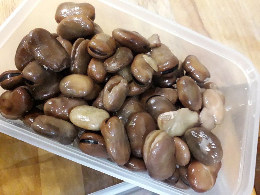 I had a second and more successful attempt at the dried fava (broad) beans. (Also known as fouls, pronounced like the April kind.) 24 hours soaking and then 5hrs on high in the slow cooker, and they came out cooked. Kind of. Some with a nut type texture; some properly squishy. Now the challenge – what to do with them!