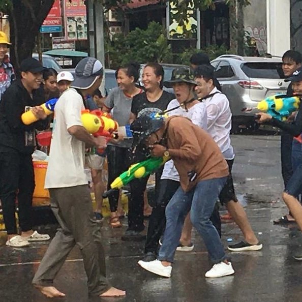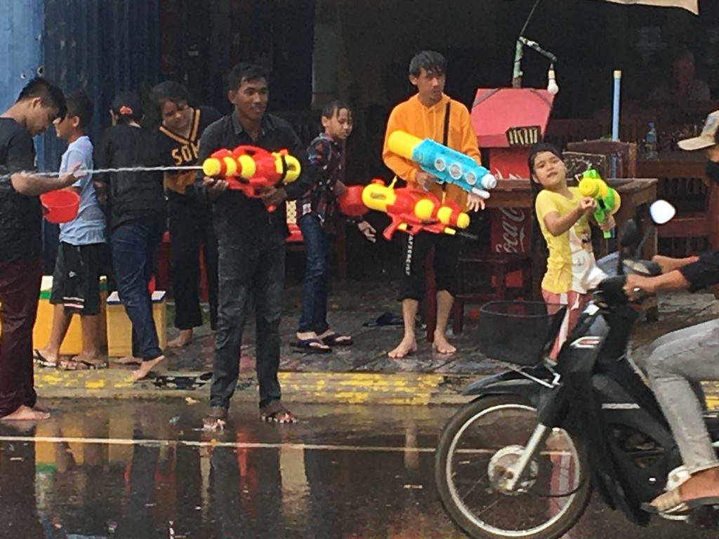I joined in, grabbing plastuc scoopfuls of water and emptying them at the Toyota crew as they shot at us from their higher position. After the Toyota, we had more success with stopping motorbikes and drenching the riders with water and shaking powder at them.