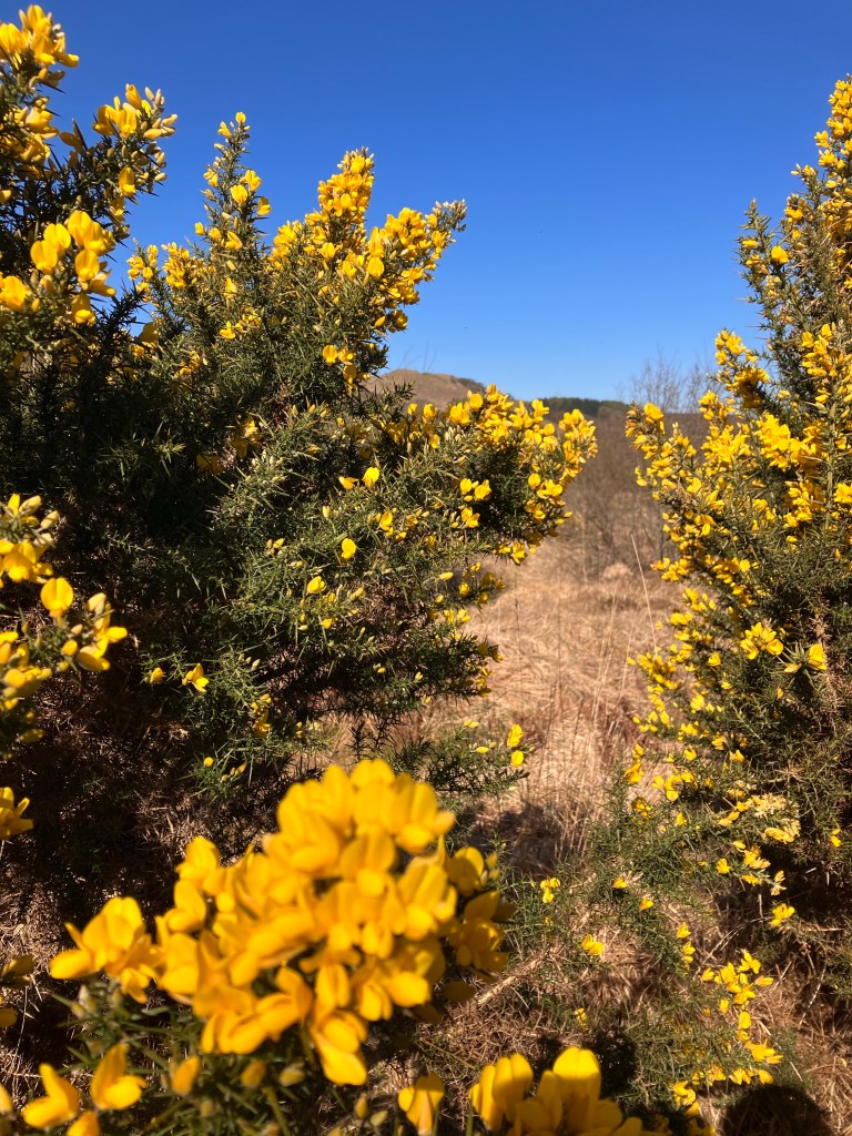 The initial walk is through woodland, opening out into farmland and views of mountains to the north. All around us birds are chirping with the high pitched frequency of a computer games console. The air smells variously of grass, mud, farm animals, and that leafy smell of a forest. I stick my nose into some gorse. The spikes stick into my fingers but I do get to inhale the coconut scent of the flowers. I set an alarm on my phone to remind us to stop and drink water every hour. Overhead the sky is blue, the sun is shining but there is still a strong wind and I keep my rain jacket on.