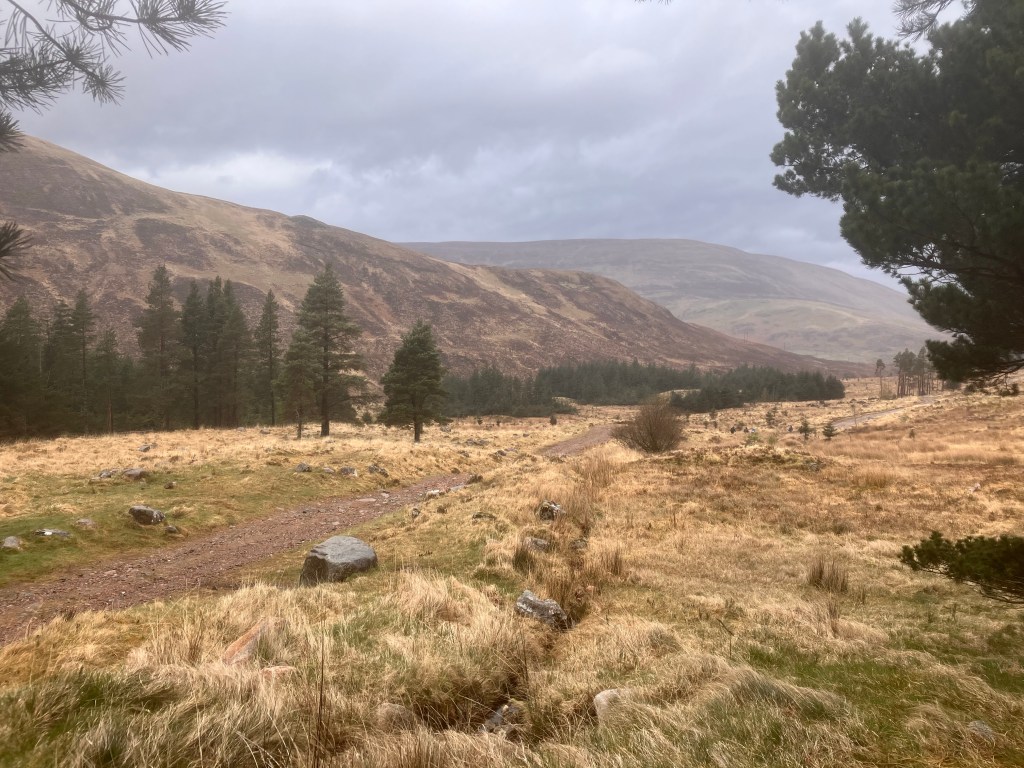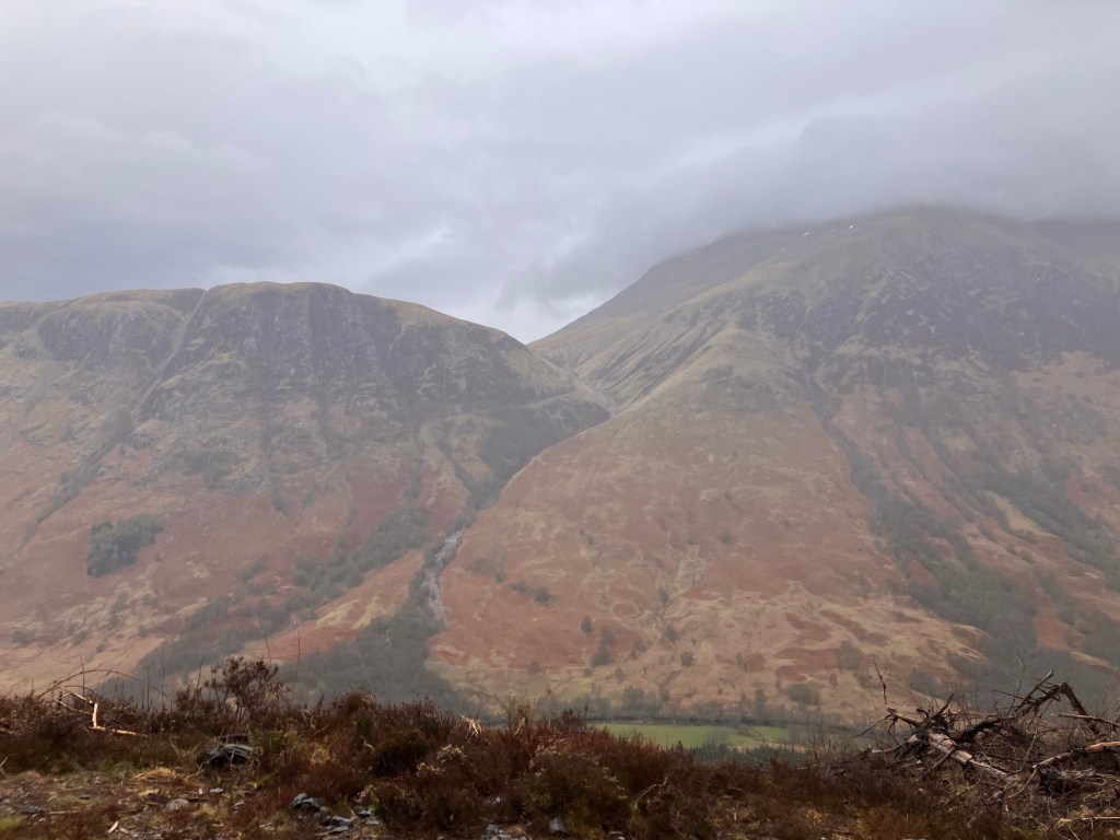 Today, we knew, would be a long day, but relatively easy for most of the way. We just had to face the climb out of Kinlochleven first. This was steeper but also shorter than the Devil’s Staircase, and soon we were up high enough to look back down on Kinlochleven. The rain had been constant and the low cloud indicated it was not going to stop anytime soon. (Spoiler alert – it didn’t.)