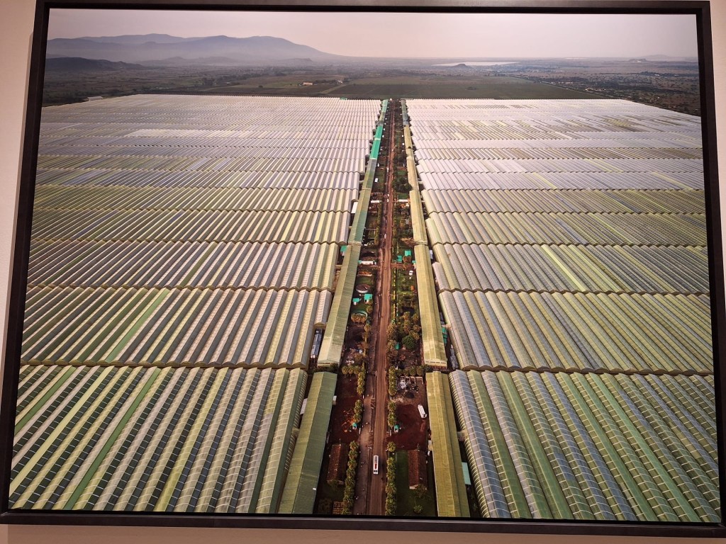 Secondly was the difference between natural and man-made/industrial forms. There was a terraced hillside in China, all curving lines to follow the shape of the mountain. There was the meandering river in Spain from which some artisanal salt production was done. These curving shapes contradicted either the straight lines of Rock of Ages mine, or the rows of greenhouses in Ethiopia that grow roses for export.