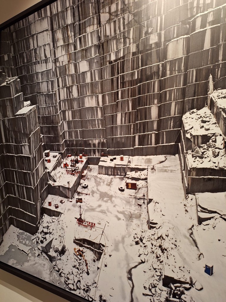 This was the largest ever exhibition of Burtynsky’s work, and included a room explaining his equipment and process. Some of the photos were stitched together out of several images to ensure the focus and clarity all the way back, e.g. when photographing workers in a factory. Some were taken from the open door of a helicopter (Burtynsky hanging out the open door with a harness), some made use of drones (the photographer working with a drone pilot) and one extra large image of a coral reef that covered a whole wall was stitched together from images taken by divers.